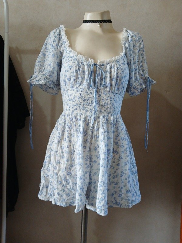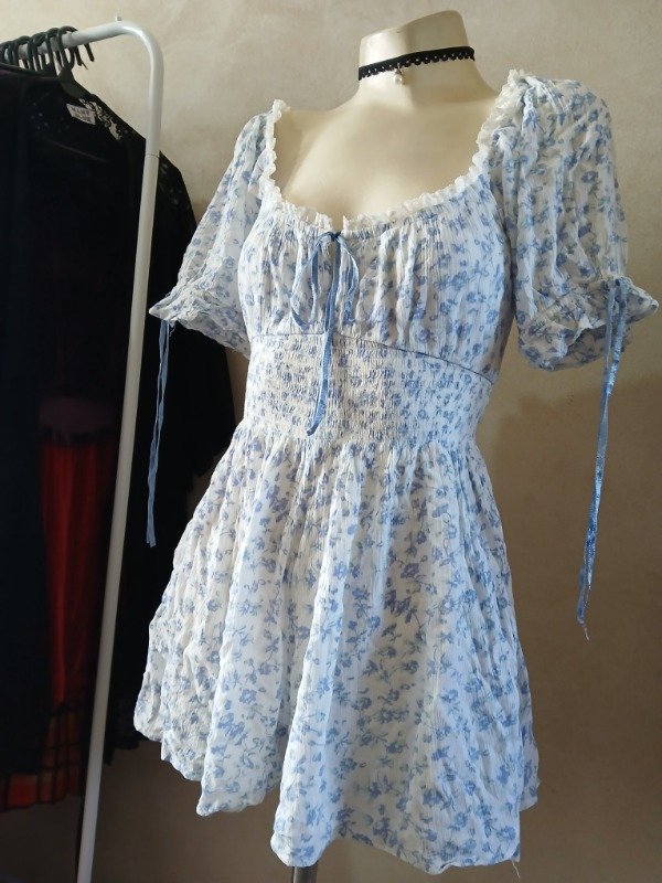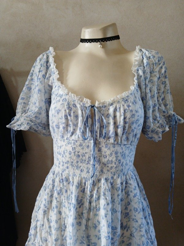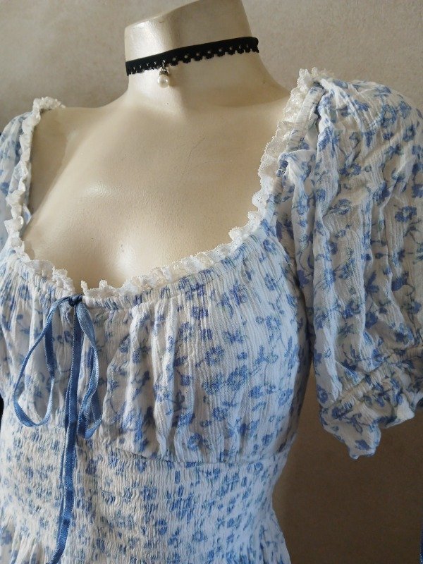 Romántico, femenino y delicado 💙. Estampado floral en tonos celeste pastel, con mangas abullonadas y escote con moñito. Favorece la figura gracias a su frunce en la cintura.